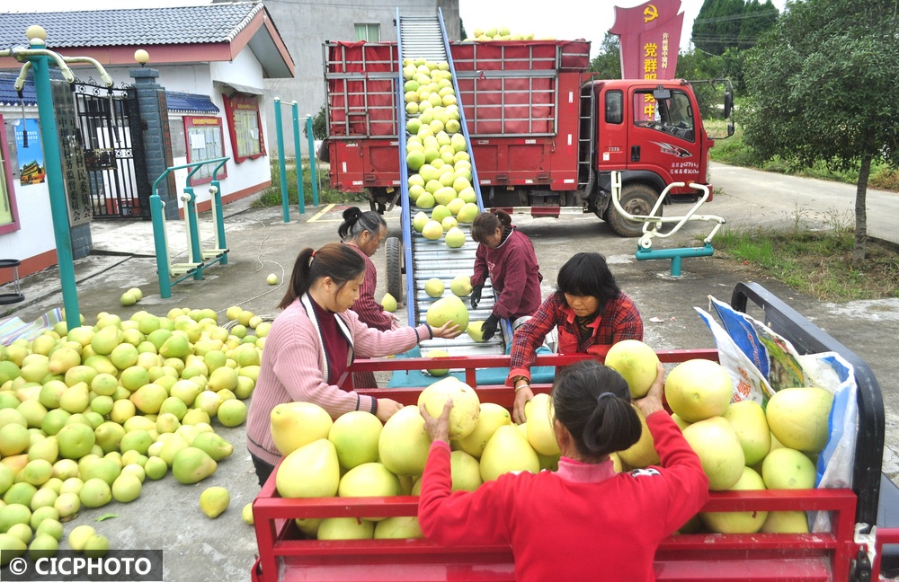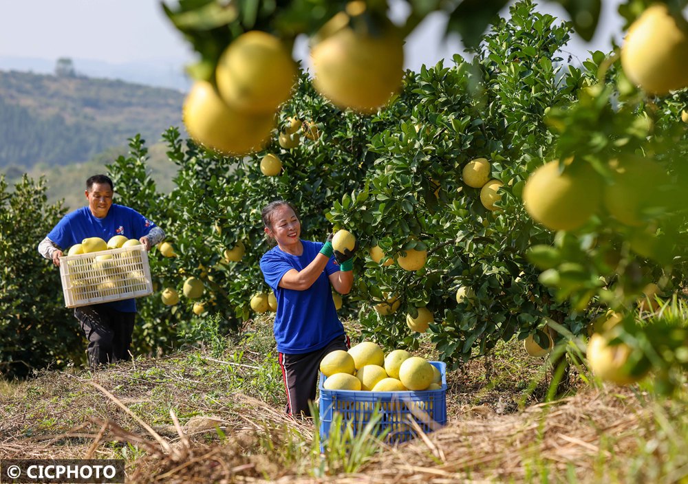 ↑2024年10月25日,贵州省铜仁市玉屏侗族自治县朱家场镇前光村村民在采摘柚子。CICPHOTO/胡攀学 摄