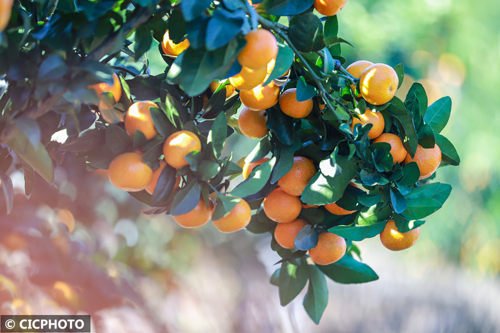↑2024年10月25日,广西桂林市灵川县灵田镇永正村,成熟的砂糖橘挂满枝头。CICPHOTO/阳海翔 摄
