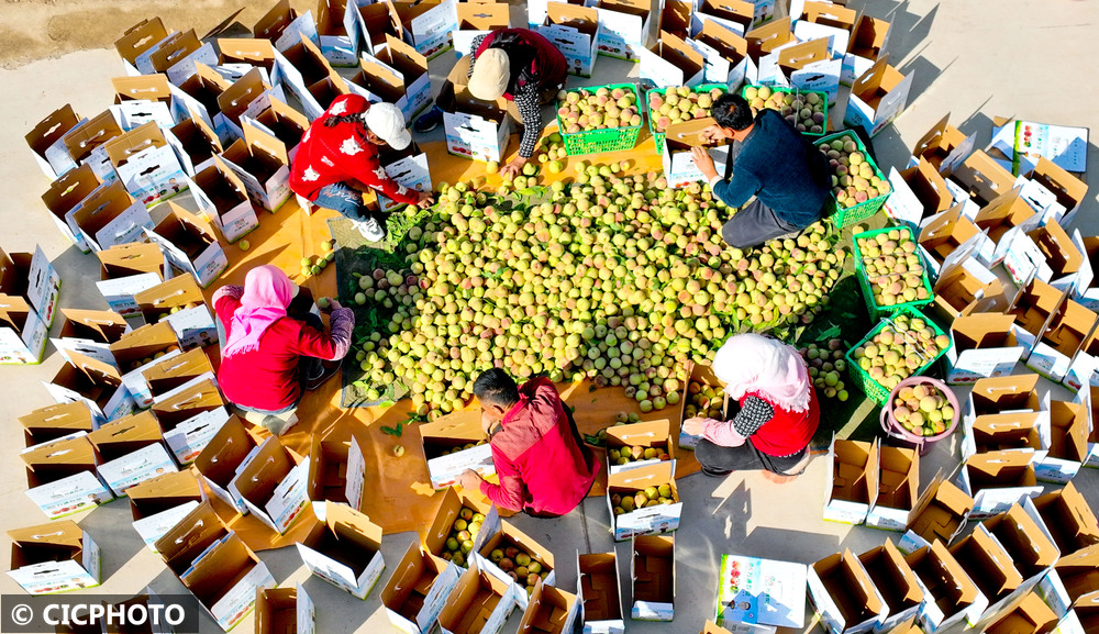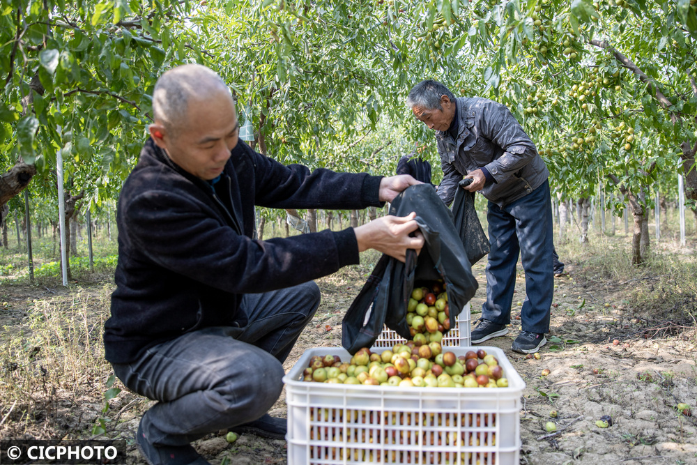 ↑2024年10月25日,河南省商丘市睢县平岗镇张井村冬枣种植基地,农民将采摘的冬枣装筐。CICPHOTO/徐泽源 摄