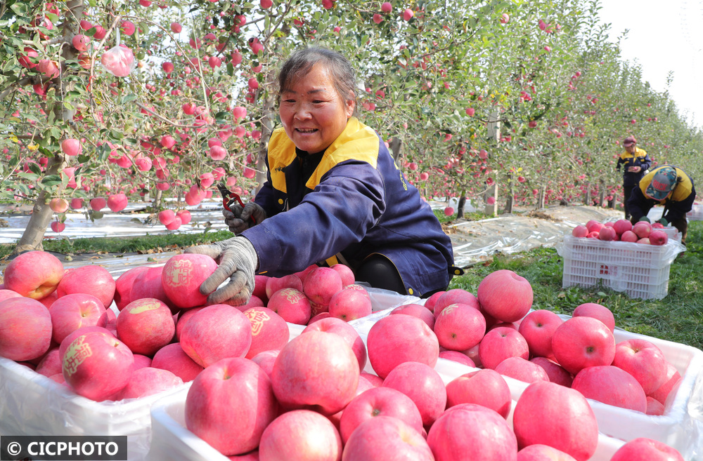 ↑2024年10月15日,陕西省渭南市白水县秋林苹果专业合作社果园,果农在采摘苹果。CICPHOTO/李军朝 摄