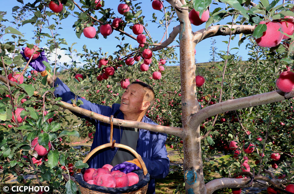 ↑2024年10月17日,甘肃省平凉市静宁县威戎镇杨湾村,果农在采摘苹果。CICPHOTO/王毅 摄