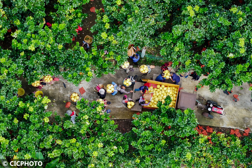 ↑2024年10月18日,贵州省黔南布依族苗族自治州罗甸县逢亭镇上隆村村民在装运刚采摘的柚子。(无人机照片)CICPHOTO/史传鸿 摄