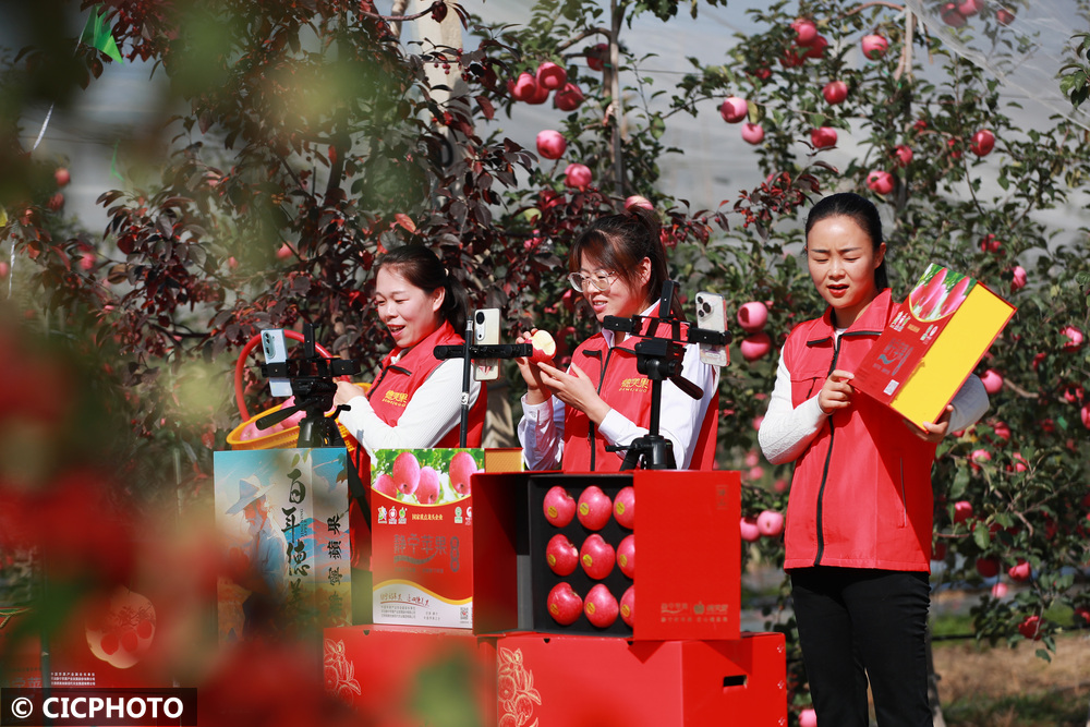 ↑2024年10月10日,甘肃省平凉市静宁县城川镇咀头村,一家果园的工作人员通过网络直播推销苹果。CICPHOTO/陈坤 摄