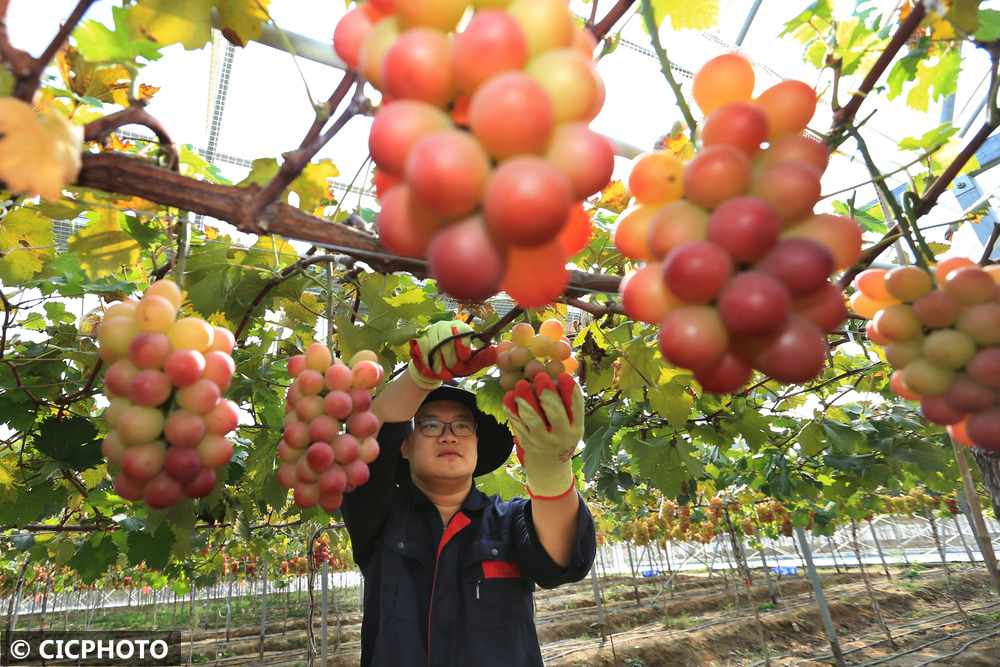 ↑2024年10月16日,山东省荣成市崖西镇一处葡萄种植园,果农在采摘葡萄。CICPHOTO/王福东 摄