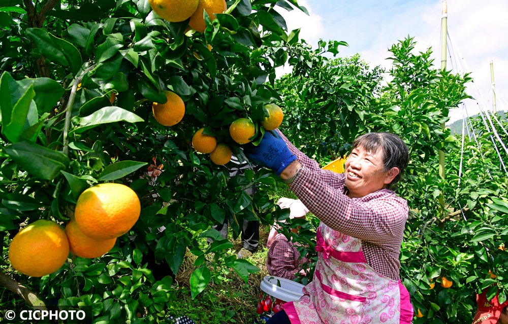 ↑2024年10月27日,湖南省邵阳市洞口县茶铺茶场管理区八角山社区柑橘园,果农在采摘柑橘。CICPHOTO/滕治中 摄