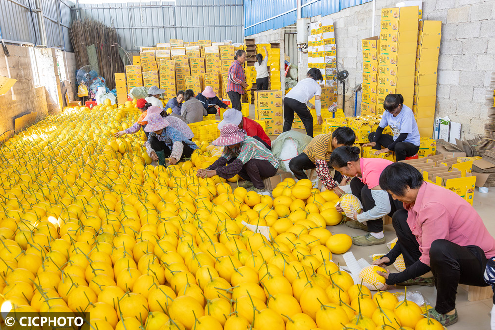 ↑2024年10月10日,广西梧州市蒙山县蒙山镇文平村,农民在分拣、包装黄金蜜露瓜,准备外运销售。CICPHOTO/黄胜林 摄