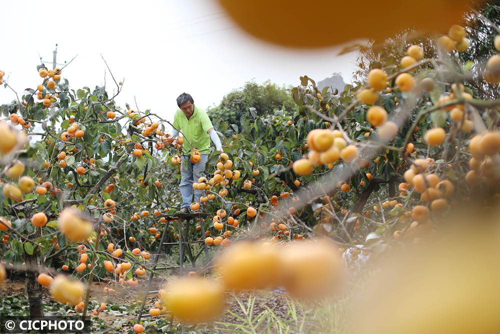 ↑2024年11月3日,广西桂林市恭城瑶族自治县莲花镇红岩村村民在采摘柿子。CICPHOTO/何红福 摄
