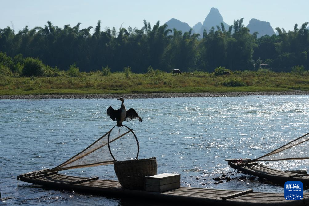 10月25日在广西桂林市阳朔县的漓江边拍摄的竹筏和鸬鹚。