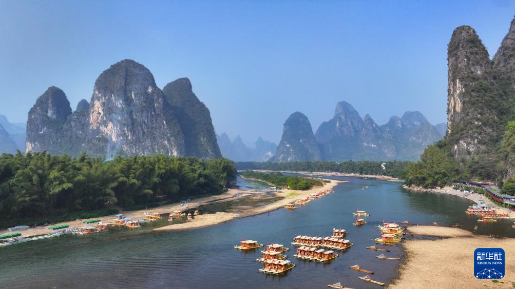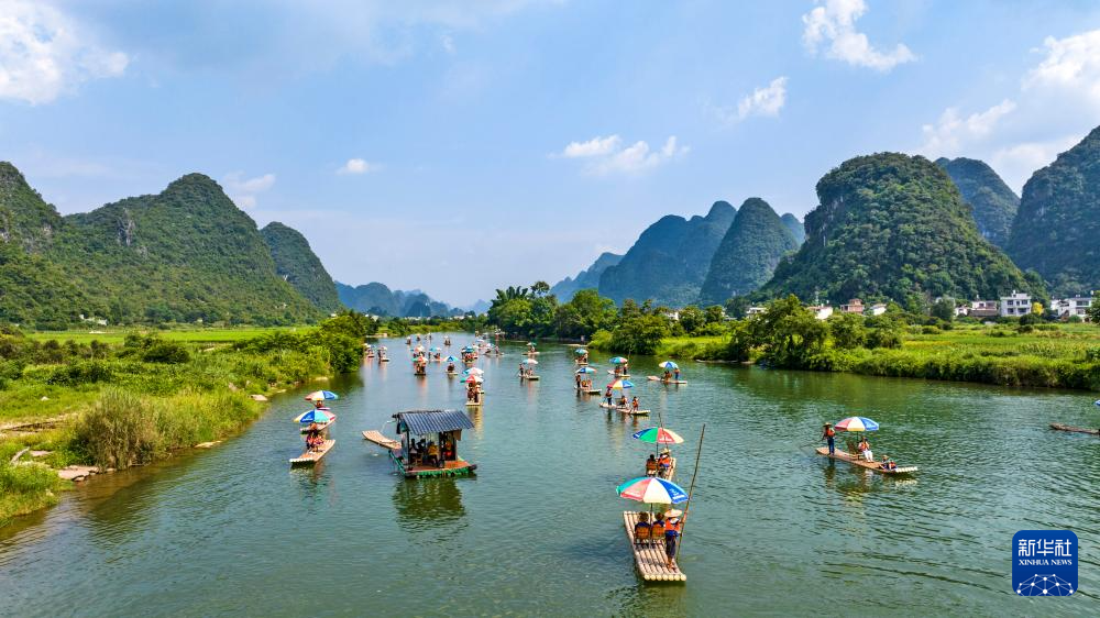 10月23日,在广西桂林市灵川县大圩镇,游客乘坐竹筏游览漓江(无人机照片)。
