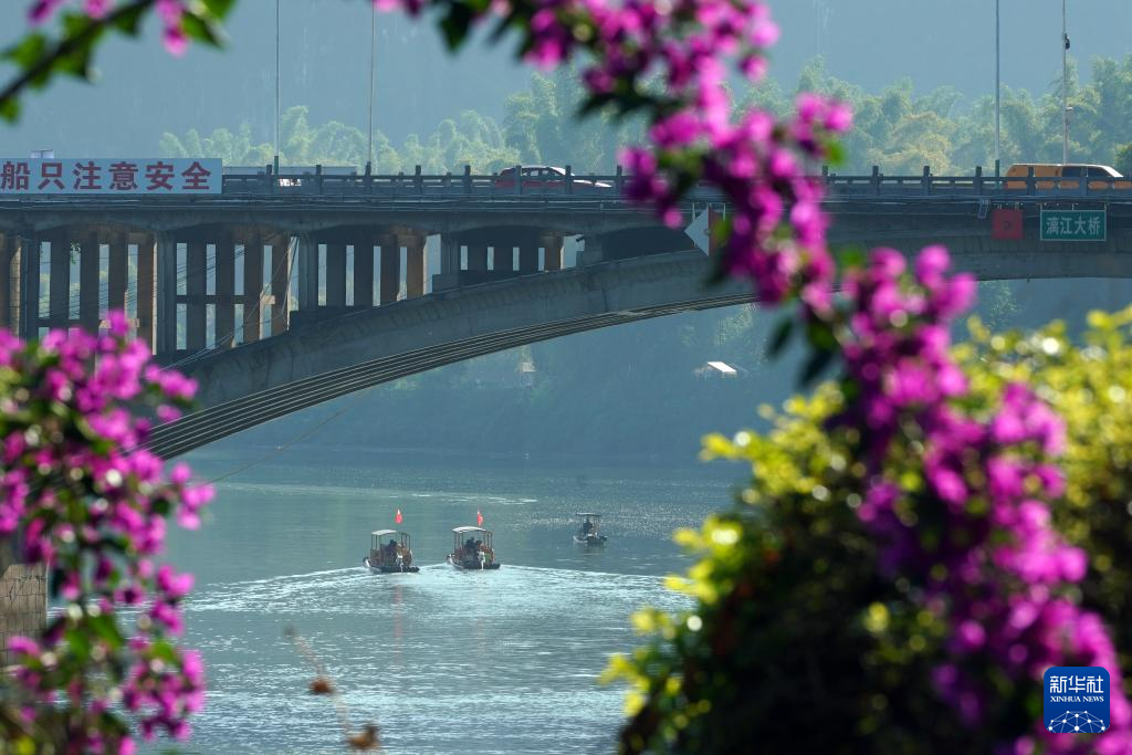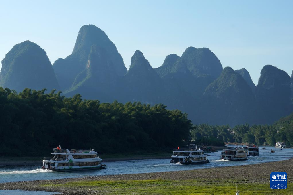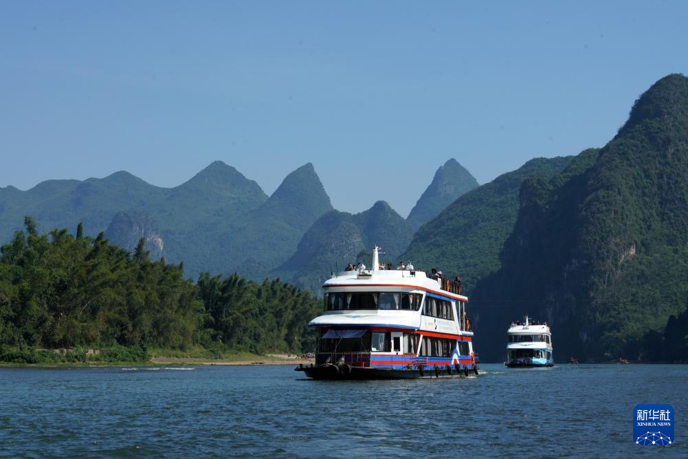10月24日,游船在广西桂林市阳朔县兴坪镇漓江河段航行。