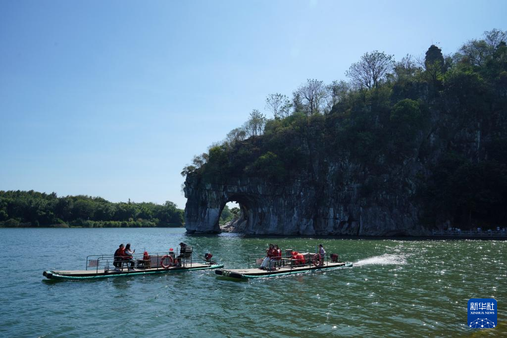 10月25日,游客在广西桂林市象鼻山景区乘船游玩。