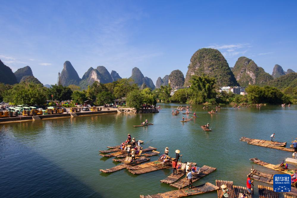 10月25日,在广西桂林市阳朔县城漓江大桥,游客乘坐竹筏游览漓江。