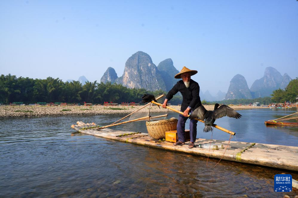 11月2日,在广西桂林市阳朔县兴坪镇的漓江边,一名老人将鸬鹚放在竹筏上。