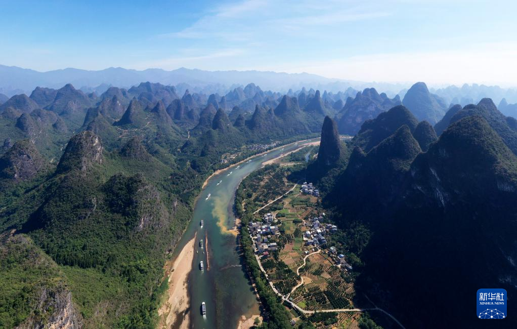 11月2日在广西桂林市阳朔县兴坪镇拍摄的漓江风光(无人机照片)。