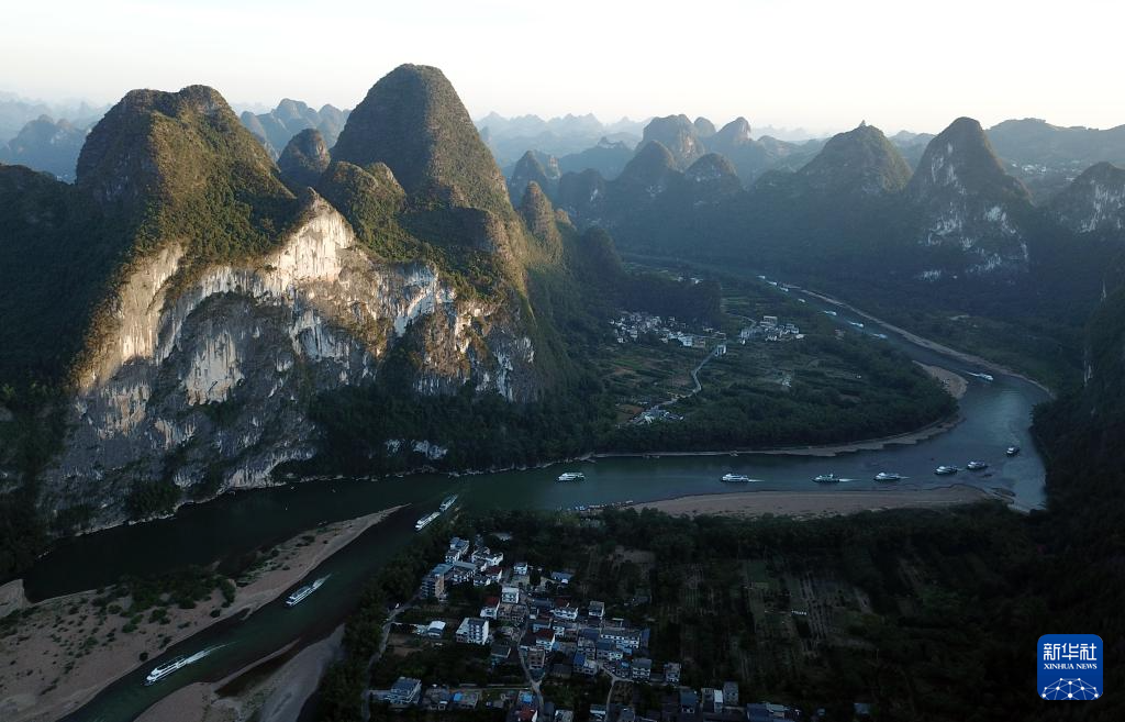 10月24日在广西桂林市阳朔县兴坪镇拍摄的夕阳余晖中的漓江山水风光(无人机照片)。