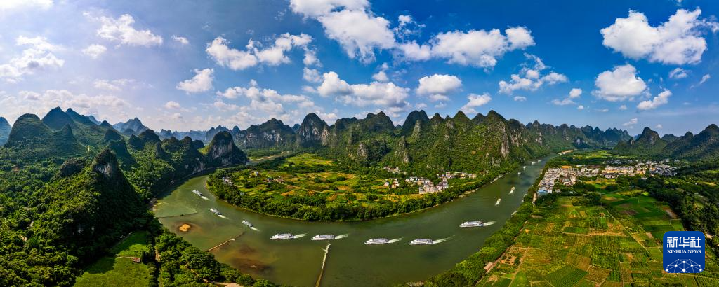 8月26日,游船行驶在广西桂林市漓江上(无人机照片)。