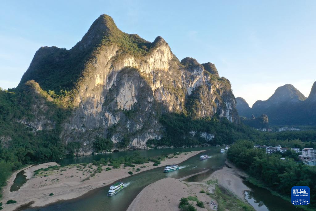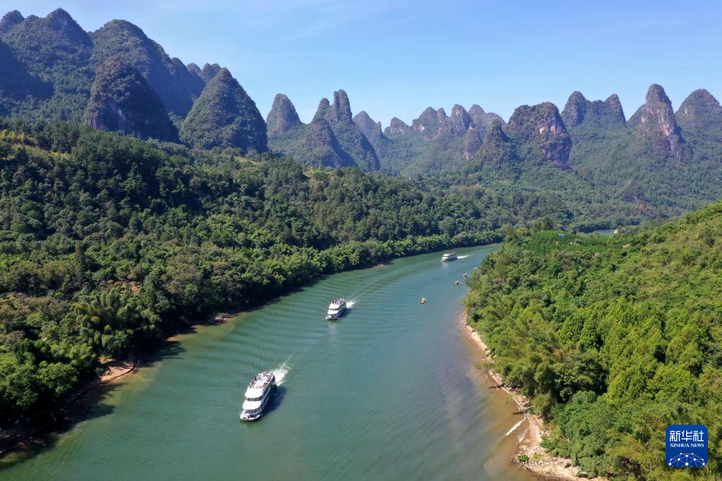 10月24日,游船在广西桂林市阳朔县漓江河段九马画山前航行(无人机照片)。