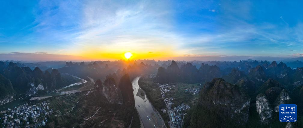 10月26日在广西桂林市阳朔县兴坪镇拍摄的漓江日落景观(无人机照片)。