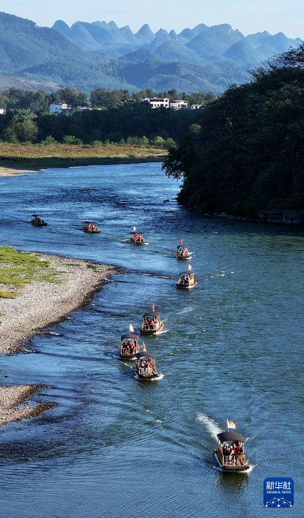10月24日,游船在广西桂林市阳朔县杨堤乡漓江河段航行(无人机照片)。