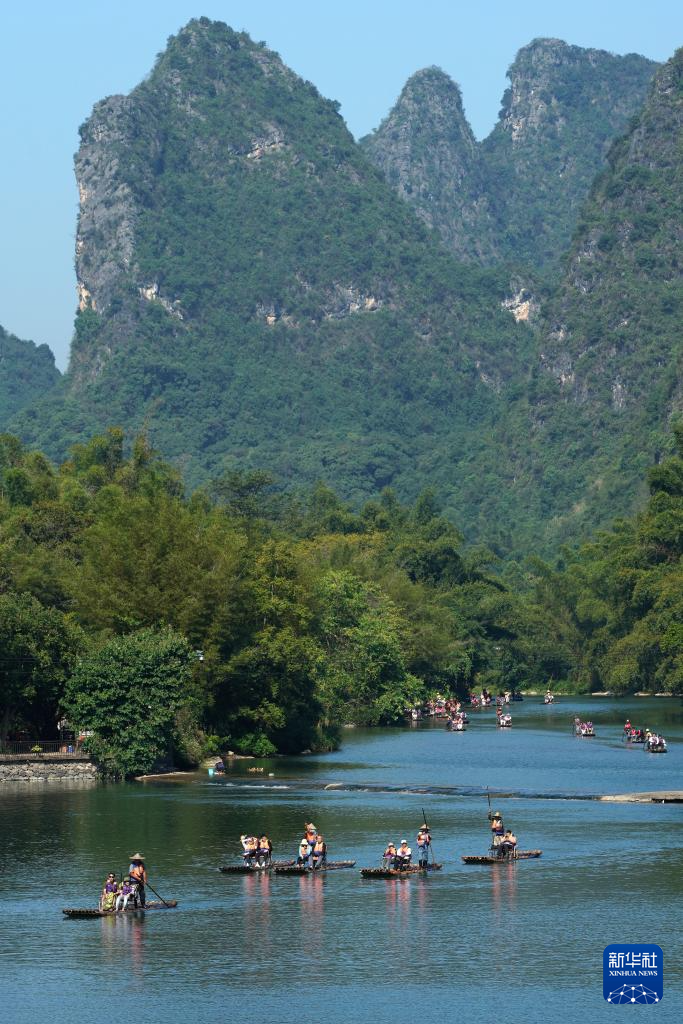 10月25日,游客在广西桂林市阳朔县境内的漓江支流遇龙河上乘坐竹筏游览。