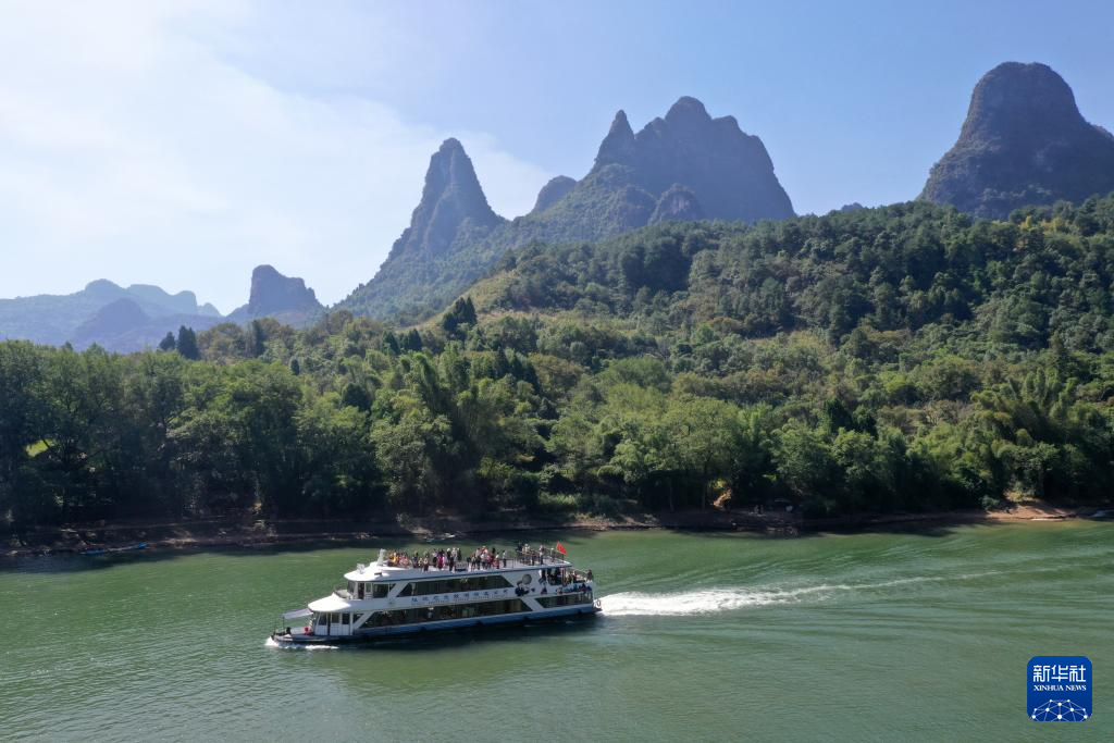 10月24日,游船在广西桂林市阳朔县杨堤乡漓江河段航行。