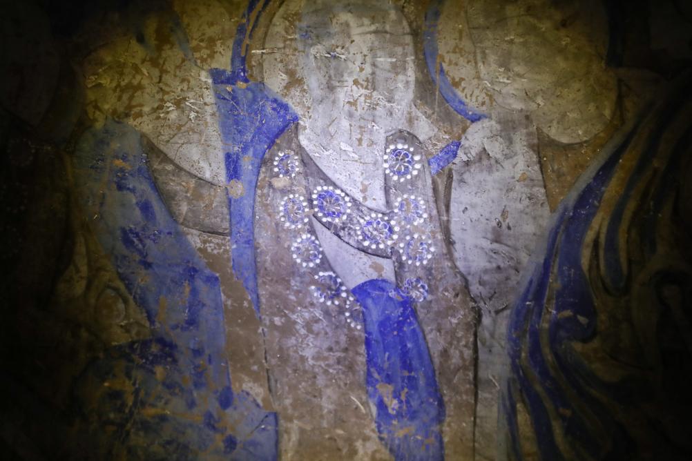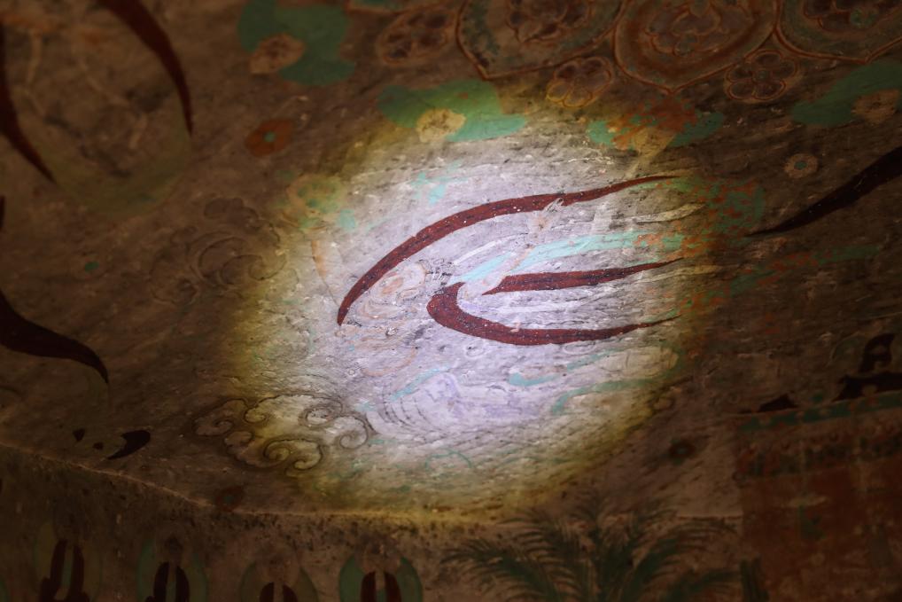 这是11月11日拍摄的炳灵寺石窟第8窟隋代壁画。其中的中亚波斯风格连珠纹见证了丝绸之路多民族往来交流。