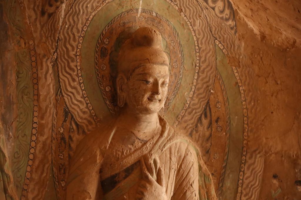 这是11月11日拍摄的炳灵寺石窟第169窟西秦造像,带有犍陀罗艺术风格。