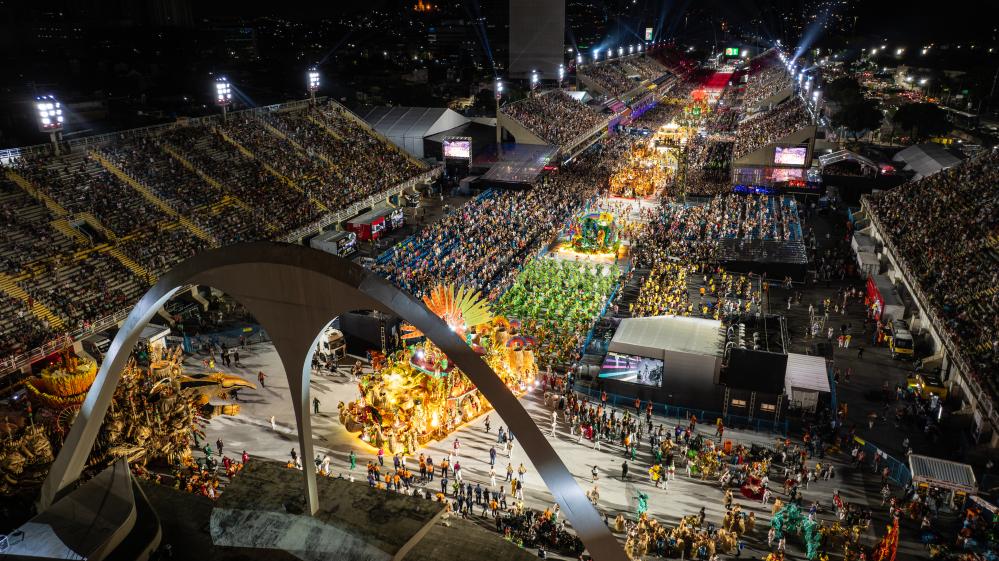 里约桑巴大道长约700米,大道尽头是阿波蒂奥希广场上的巨大拱形纪念碑。阿波蒂奥希一词同样来自希腊语,意为崇拜某物到神化的地位。纪念碑后是里约依山而建、无穷无尽的居民区,平房的灯光在夜幕中犹如点点星光,伴随着阿波蒂奥希之拱的彩灯一起闪耀。