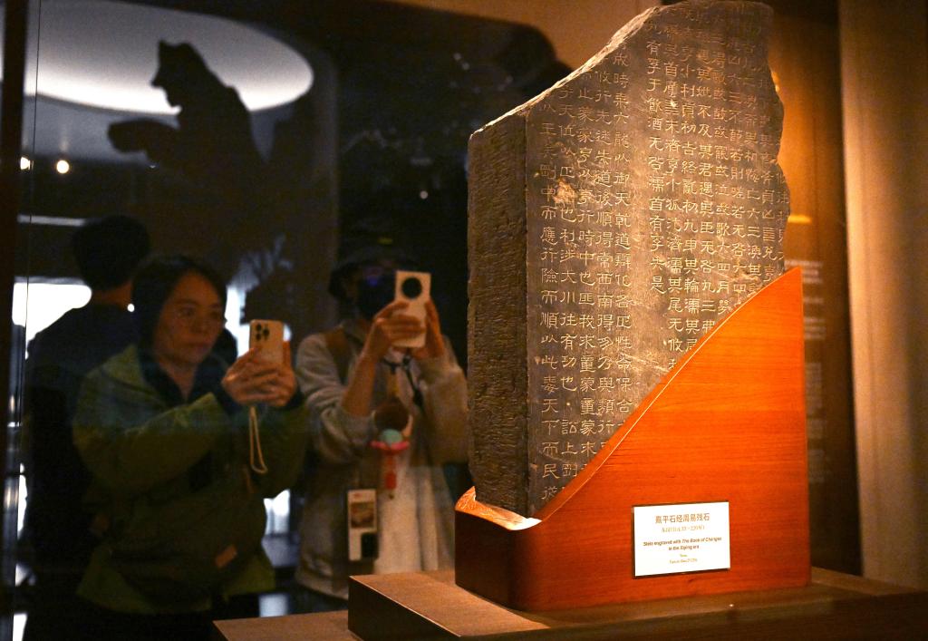 11月14日,观众在上海博物馆东馆中国历代书法馆拍摄东汉时期的《熹平石经周易残石》。