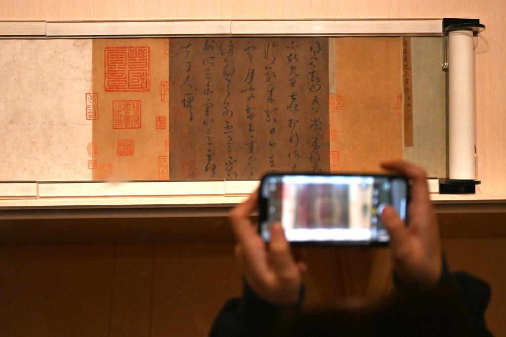 11月14日,观众在上海博物馆东馆中国历代书法馆拍摄东晋王羲之的《草书上虞帖卷》(局部)。