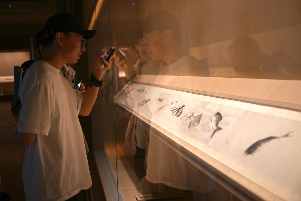 11月14日,观众在上海博物馆东馆中国历代绘画馆拍摄清代朱耷的《鱼鸭图卷》。
