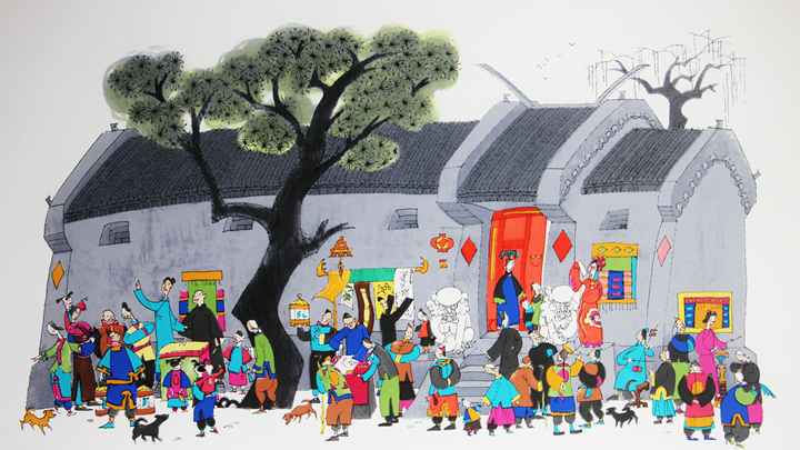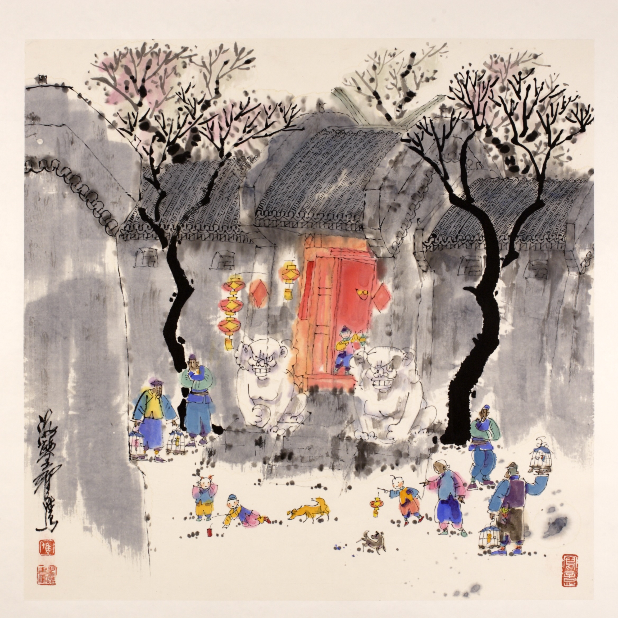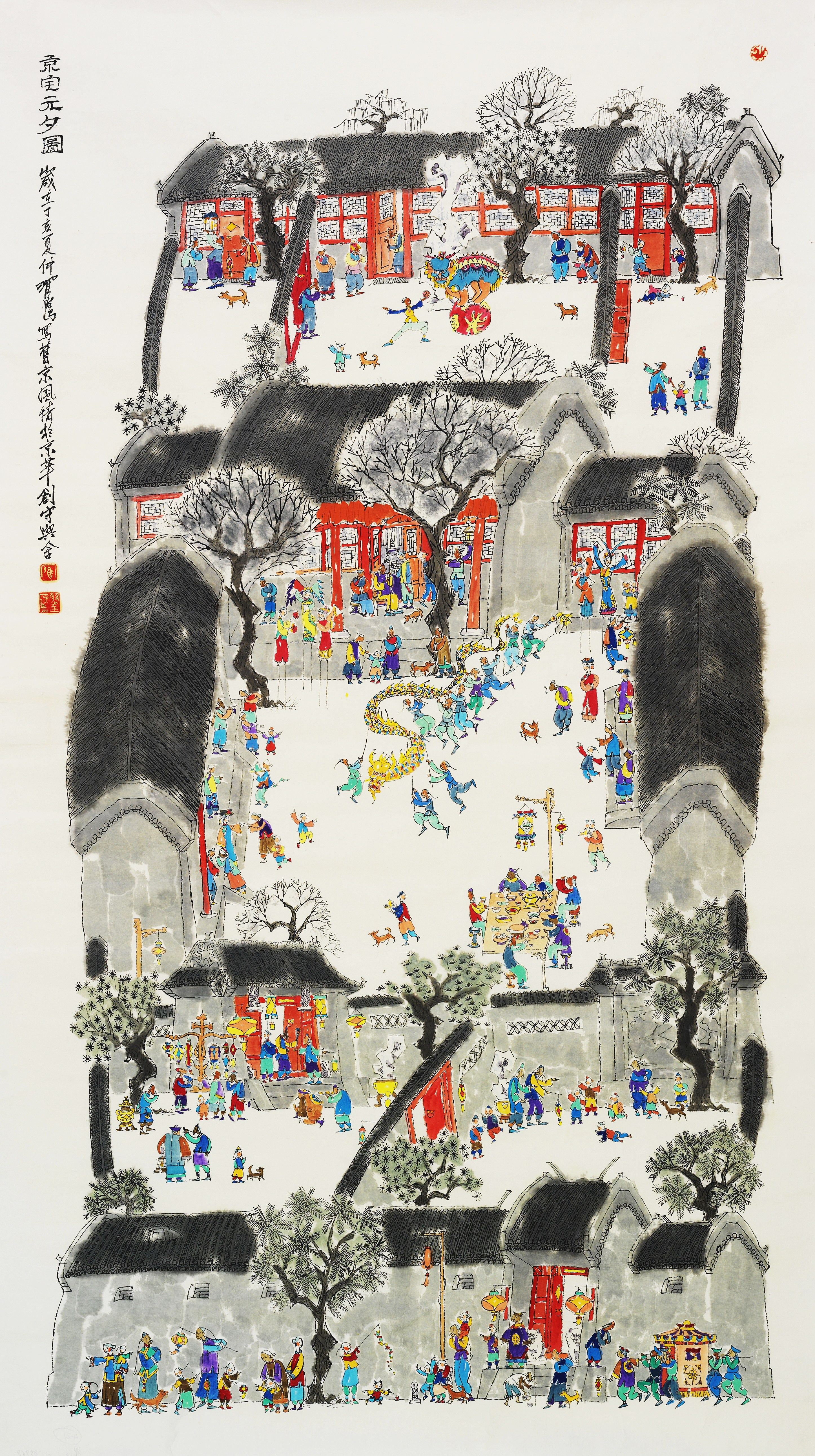 翟鹰作品《胡同闹元宵》纸本设色120x40cm 2015