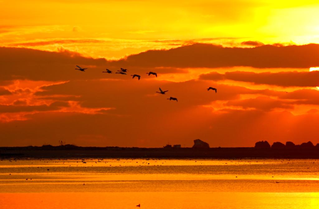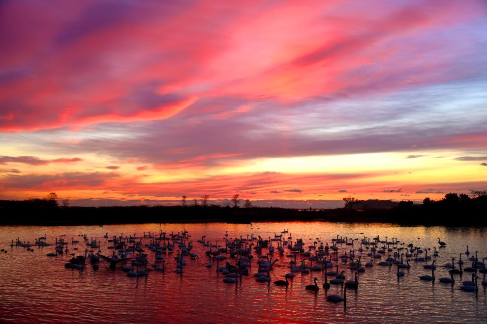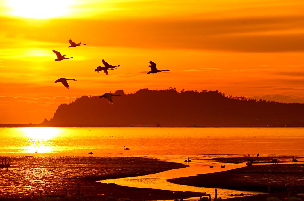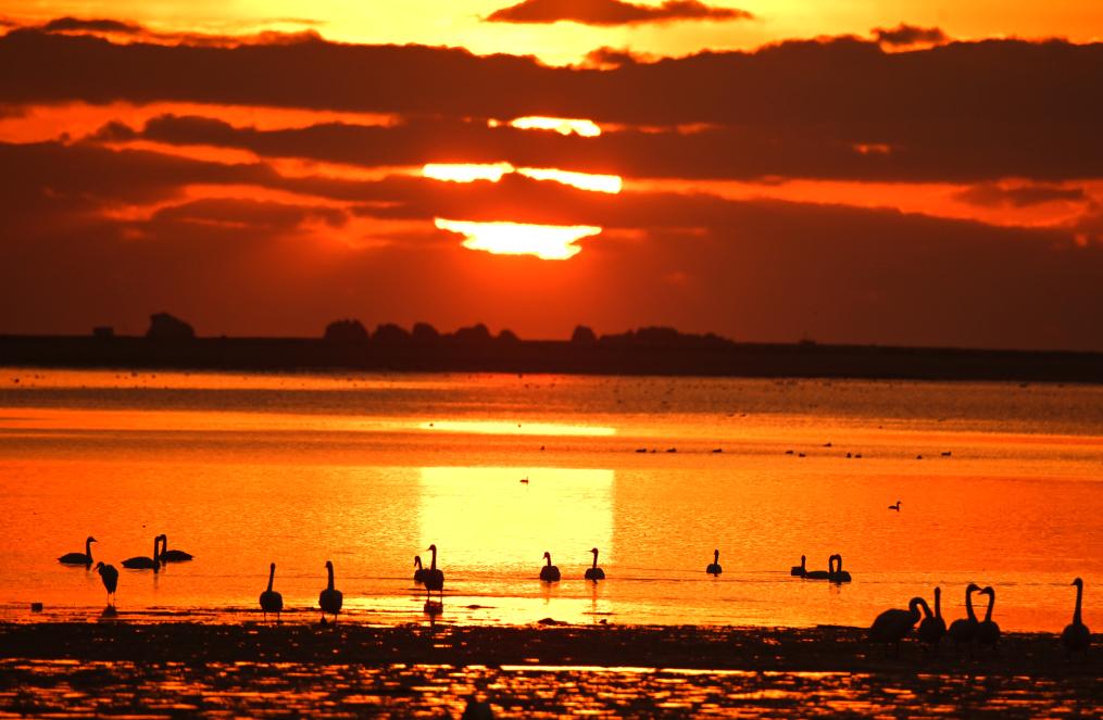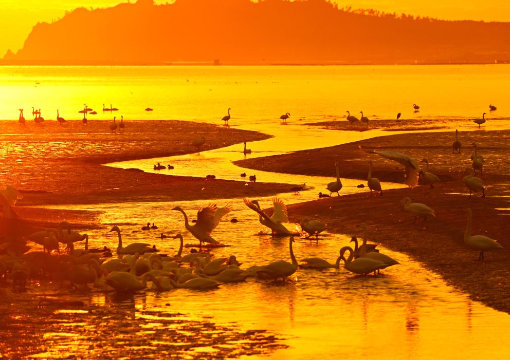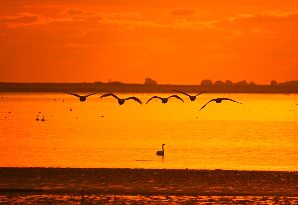 2024年11月19日清晨,在山东省荣成市大天鹅自然保护区成山天鹅湖畔,大天鹅或嬉戏觅食、或迎着朝霞飞舞,构成一幅和谐美丽的生态画卷。