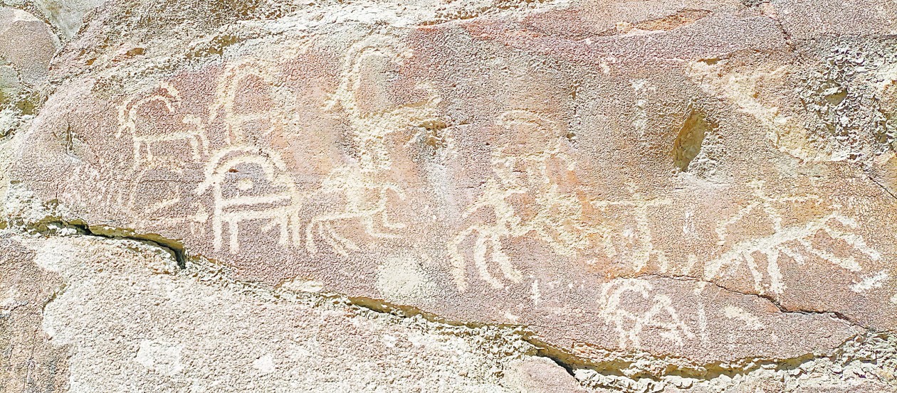 在当地语言中,“Haldeikish”的意思是“公野山羊的栖息地”,岩画上确实画了很多野山羊,有的在草地上吃草,有的正被猎人射杀……笔触精炼又栩栩如生。除了野山羊,岩画上还画有颇具风格的马、树、几何图案、佛教宗教符号等。