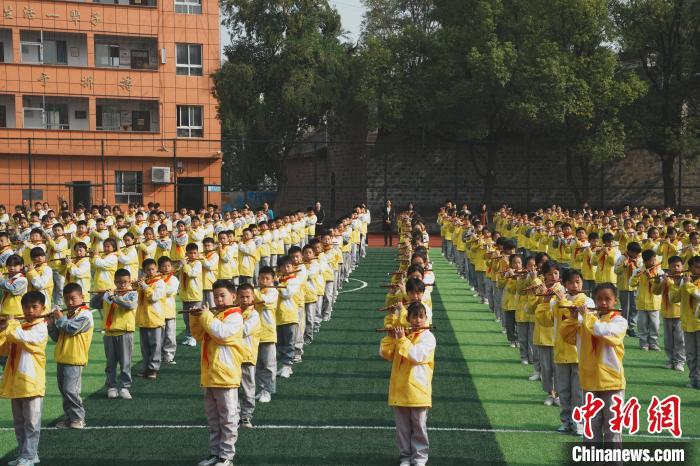 11月6日,贵州省玉屏侗族自治县印山民族小学的学生在操场吹奏箫笛。周燕玲 摄