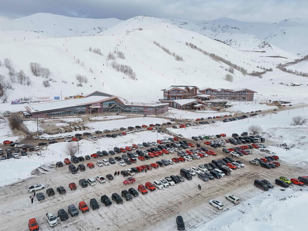 缤纷的色彩直观体现在进村路上。除了常见的黑白两色,橘红、紫色、粉色等个性十足的越野车越来越多,车辆顶部的行李架上还载着五颜六色的雪具。