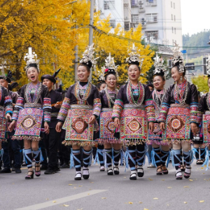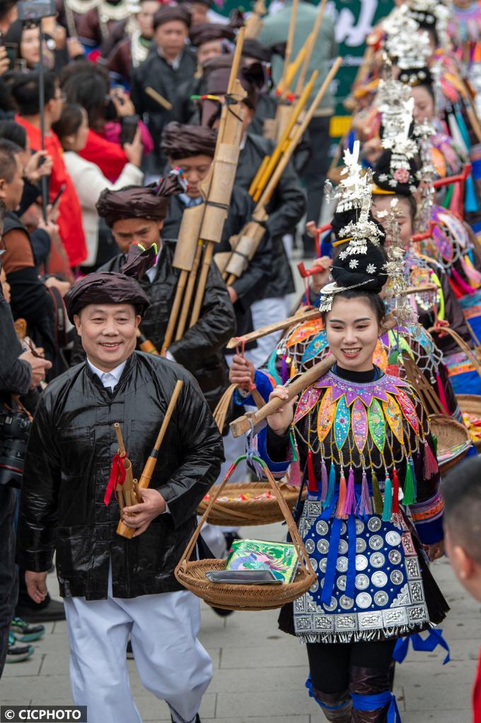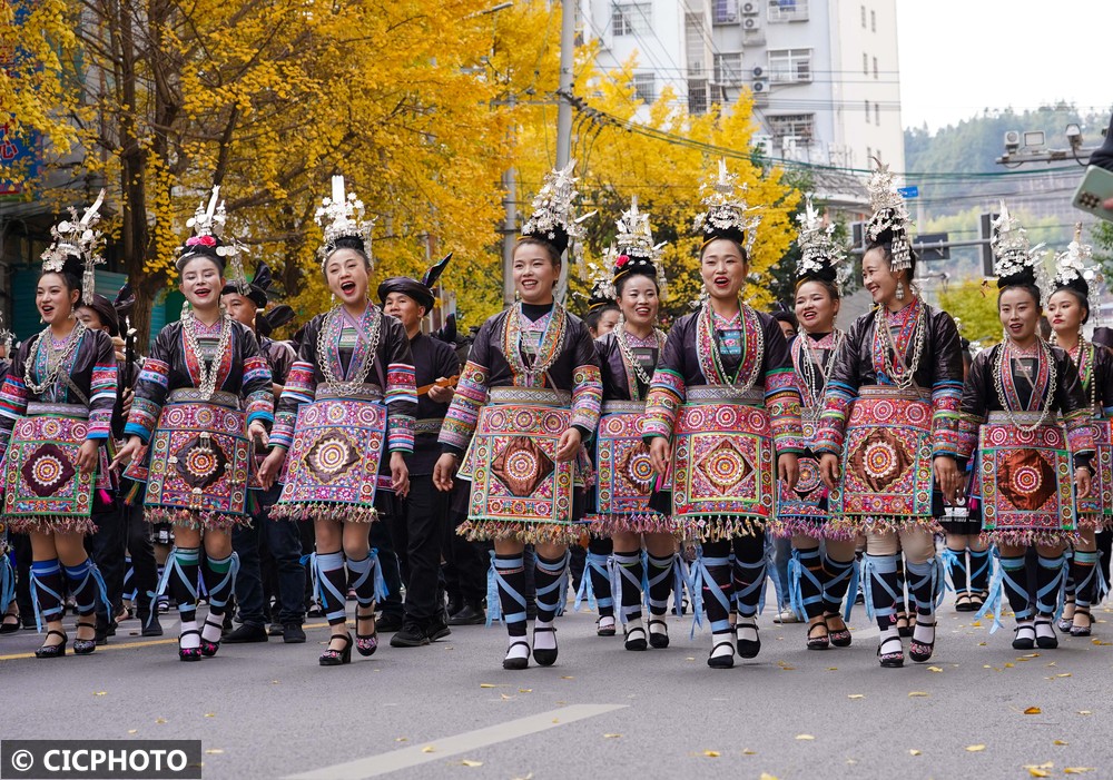 ↑2024年12月1日,侗族群众身穿节日盛装在贵州省黔东南苗族侗族自治州黎平县侗年庆典上参加巡游活动。CICPHOTO/卢忠南 摄