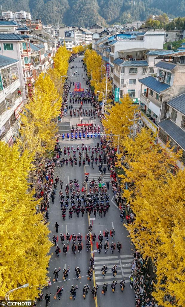 ↑2024年12月1日,侗族群众身穿节日盛装在贵州省黔东南苗族侗族自治州黎平县侗年庆典上参加巡游活动。(无人机照片)CICPHOTO/卢忠南 摄