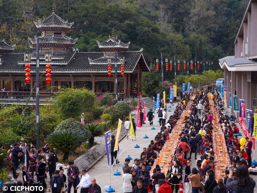 ↑2024年11月30日,人们在贵州省黔东南苗族侗族自治州从江县第十七届原生态侗族大歌节活动现场吃长桌宴。CICPHOTO/卢忠南 摄