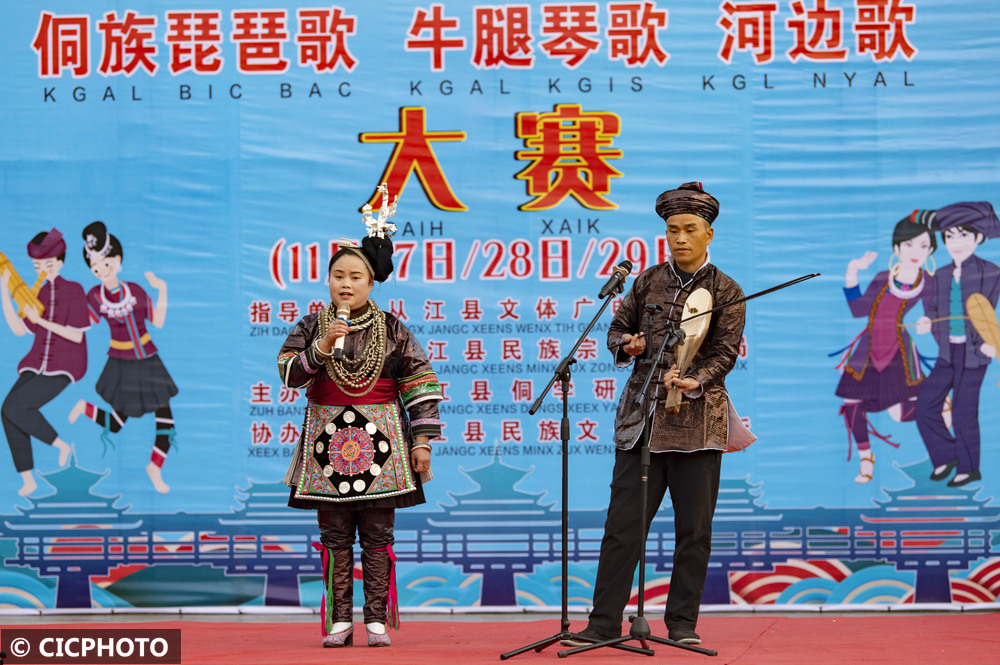 ↑2024年11月28日,在贵州省黔东南苗族侗族自治州从江县鼓楼广场,参加第十七届原生态侗族大歌节牛腿琴歌大赛的选手在演唱牛腿琴歌。CICPHOTO/吴德军 摄 编辑:马兰