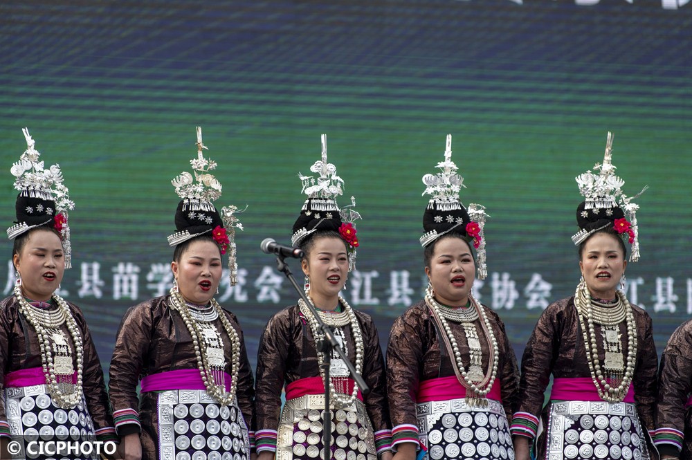↑2024年11月30日,侗族群众在贵州省黔东南苗族侗族自治州从江县第十七届原生态侗族大歌节活动现场演唱侗族大歌。CICPHOTO/吴德军 摄