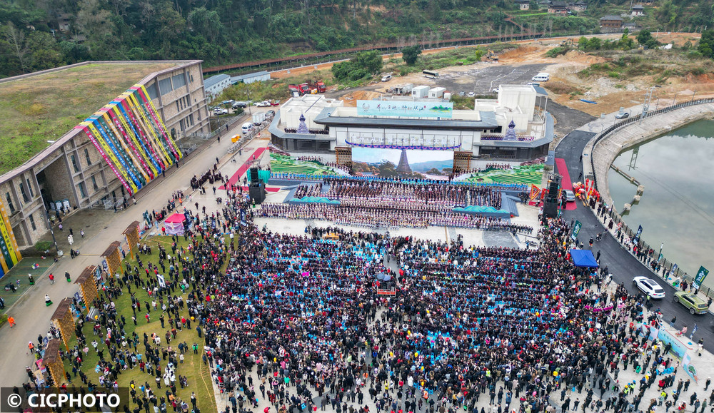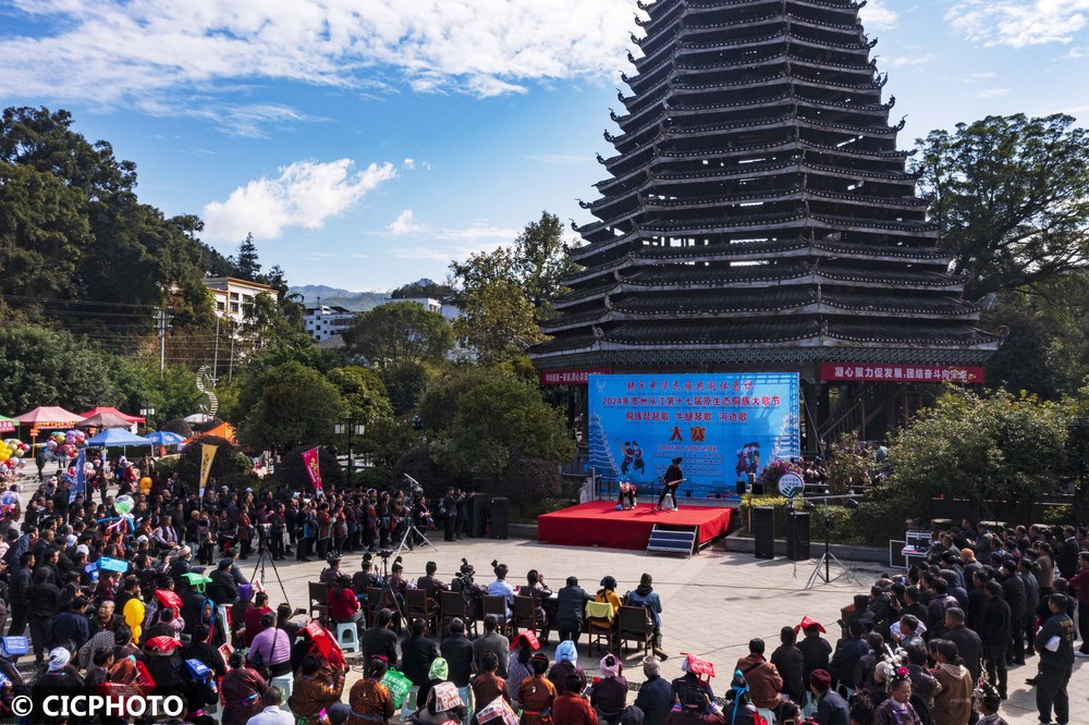 ↑2024年11月30日在贵州省黔东南苗族侗族自治州从江县拍摄的第十七届原生态侗族大歌节活动现场。(无人机照片)CICPHOTO/卢忠南 摄