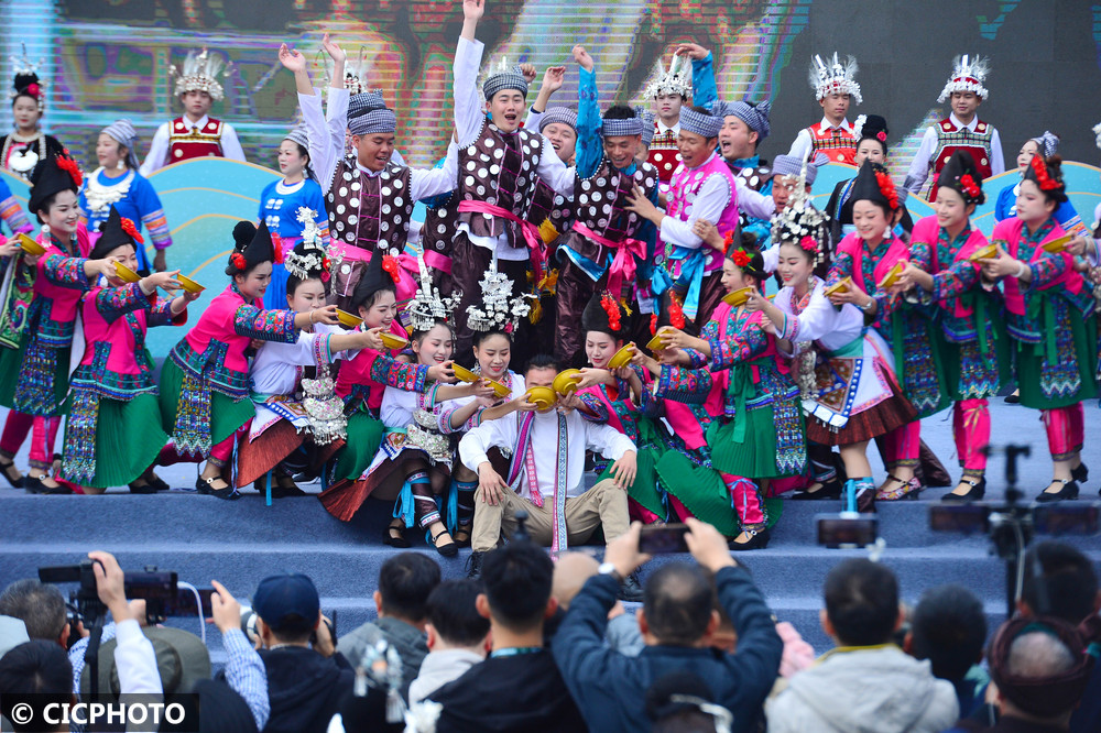 ↑2024年11月30日,人们在贵州省黔东南苗族侗族自治州从江县第十七届原生态侗族大歌节活动现场表演节目。CICPHOTO/卢忠南 摄