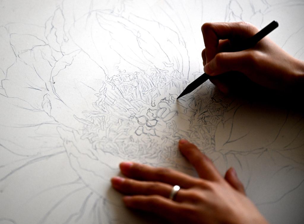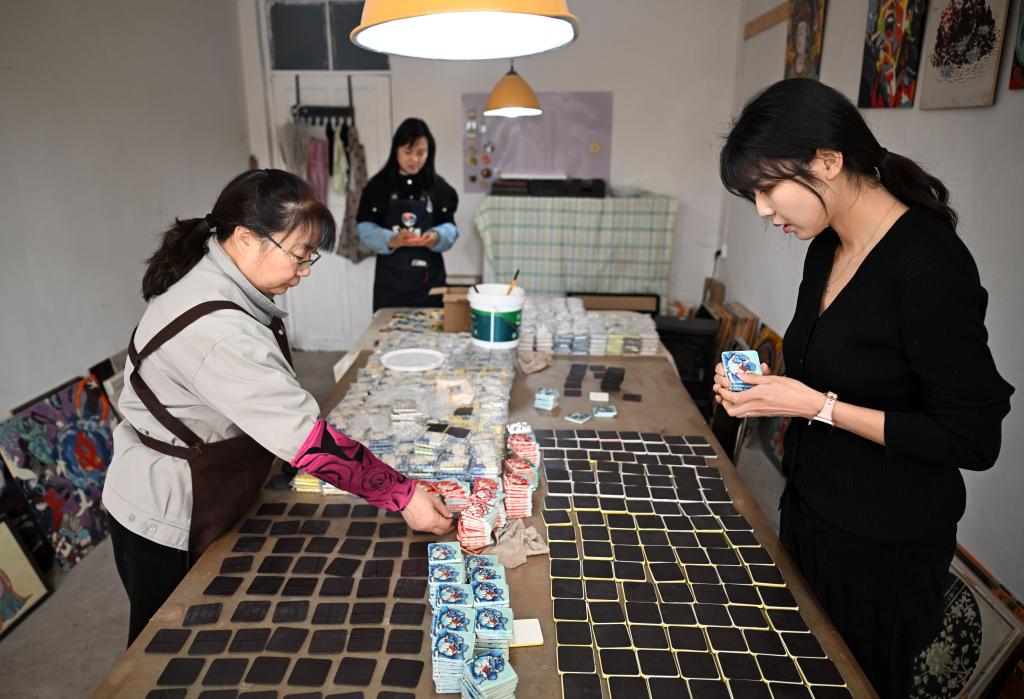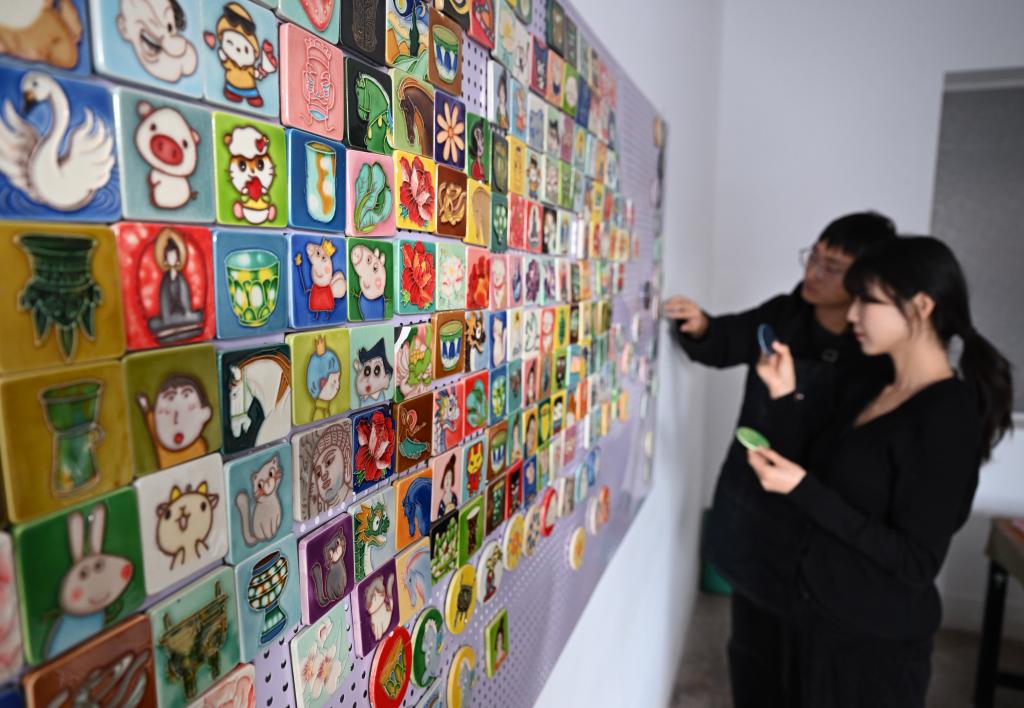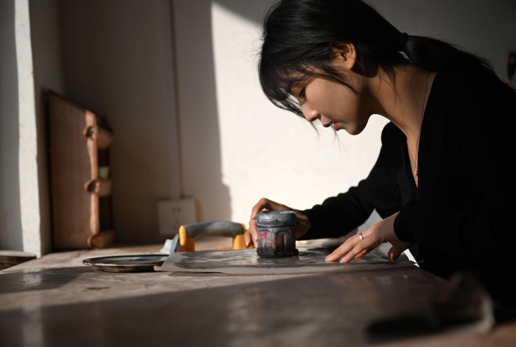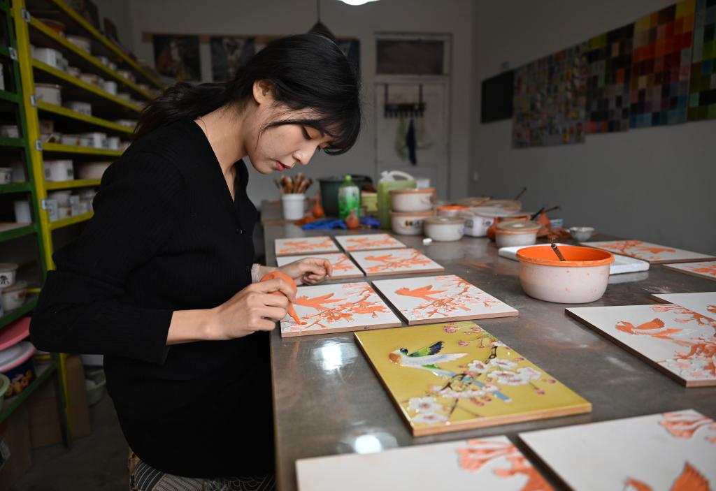 在洛阳花城美陶工作室,今年27岁的成果是河南省洛阳市非物质文化遗产三彩壁画制作技艺的第五代传承人。她自幼跟随父亲学习绘画,16岁时开始和父亲一起参与三彩壁画的制作。通过不断实践与积累,成果目前已能够熟练掌握画稿、扎稿、立线、施釉、烧制等三彩壁画制作技艺的关键步骤。