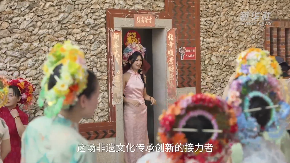 在蟳埔村,这样簪发戴花被称为“簪花围”,是闽南地区渔家女的传统穿戴习俗。2008年,以“簪花围”为代表的蟳埔女习俗被列入第二批国家级非遗名录。