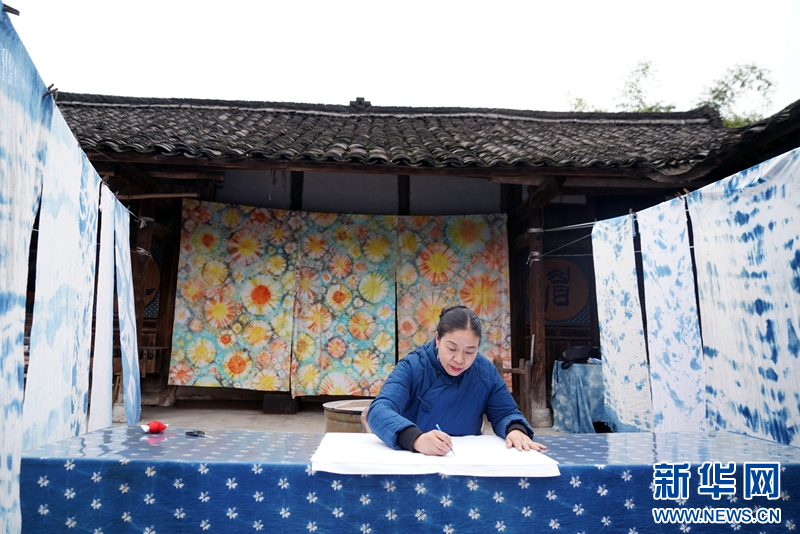 峨眉扎染有画稿、缝制、扎结、调制染料、入染、出染、漂洗、拆线、晾干等工序,每一道工序都需要手工完成。图为王永清在布上画稿。