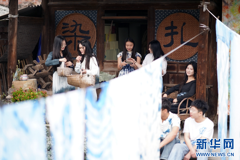 峨眉扎染受到越来越多年轻人的喜爱。图为年轻人在现场“打卡”拍照。