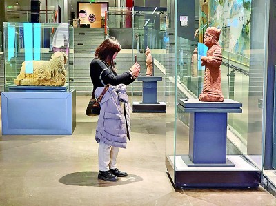 古人有何娱乐?汉代画像砖如同一张张“古时的照片”,记录了广都人宴乐、市井、车马等丰富多彩的娱乐活动。展厅内成组的舞蹈俑、说唱俑姿态各异、表情丰富。另一边,几只套有绳扣的陶狗,与今人疼爱的宠物并无二致。