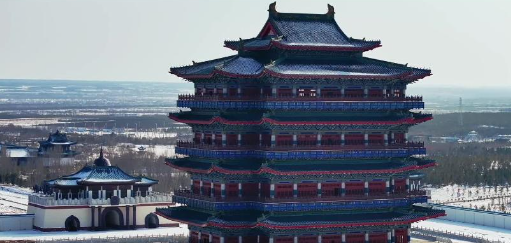 位于内蒙古鄂尔多斯市伊金霍洛旗境内的鄂尔多斯文化产业园,白雪皑皑,骏马疾驰,与古建筑交相辉映。蒙白的黛瓦,覆雪的脊兽,与雪相接,与天一色。雪地草原,一望无际,策马奔腾踏出一幅雪上画卷。