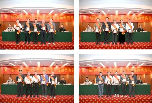 在欢快的乐曲声中,获奖者一一上台领奖,与会领导专家为他们颁发了荣誉奖牌。李冰、黄荣生、李景新、王旭东等在致辞中对大会的召开、对获奖者表示热烈的祝贺。山西省的郭建荣,中国诗书画家网高级书画家、华夏开明书画院理事刘伯玮代表参会获奖者上台发言:能够在第三届“神州颂”年赛中获奖感到很幸运,能够受邀参加颁奖大会非常高兴,更为能够与各位领导专家见面,当面聆听他们对艺术的真知灼见;能够与诗书画界的同仁共同探讨艺术追求道路上的所思、所感而欣喜。在今后的日子里,将珍惜这份荣誉,不忘初心,继续努力研习诗书画,为弘扬中华文化,践行大书法贡献自己的力量。会后,与会领导专家为参会代表签名并合影留念。